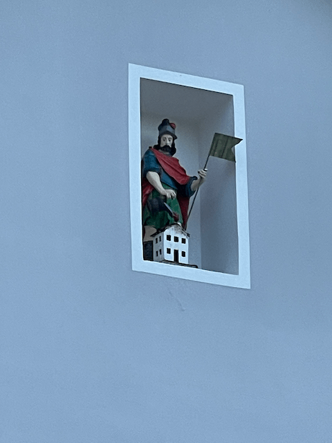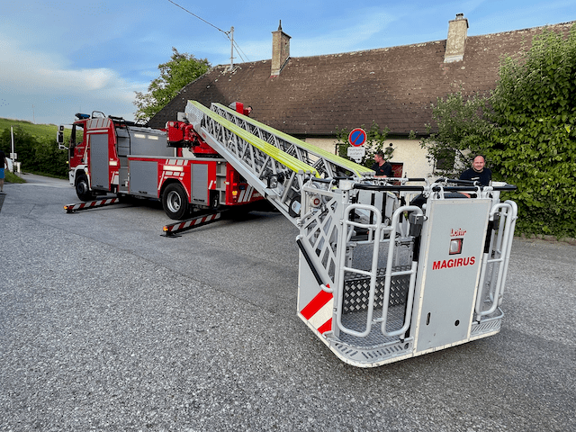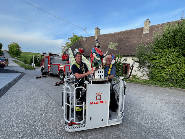 Am 18. Juli 2022 konnten wir den Umbau des Feuerwehrhauses offiziell abschließen – der heilige Florian wurde mithilfe der Nettingsdorfer Drehleiter wieder an seinen Platz gebracht