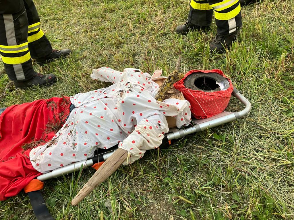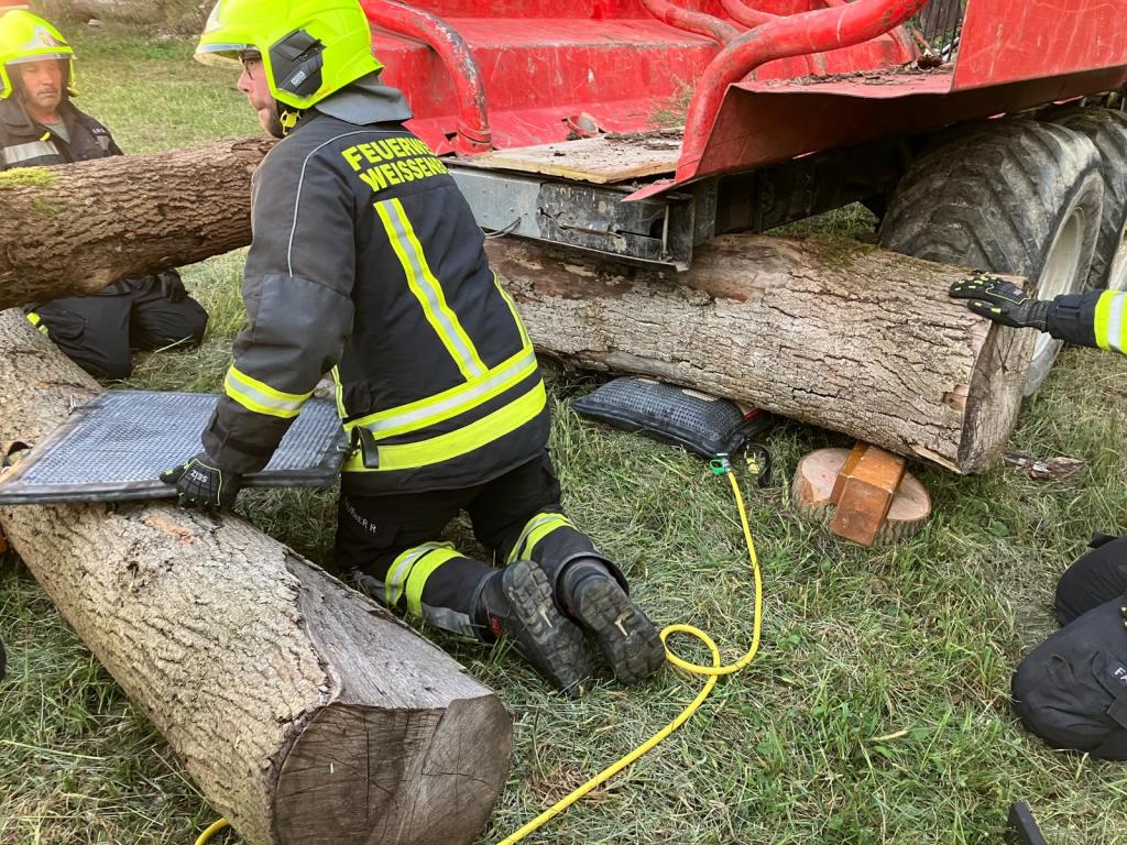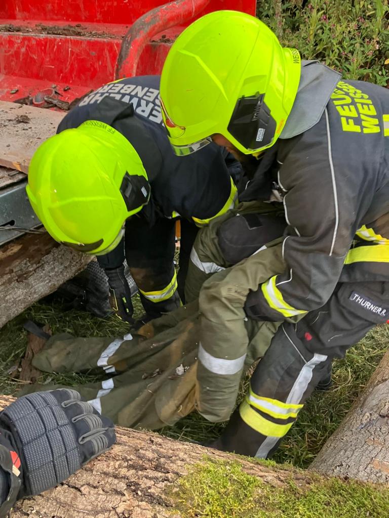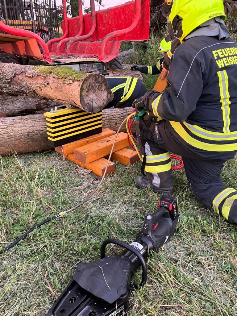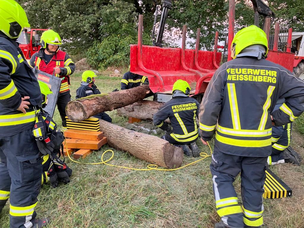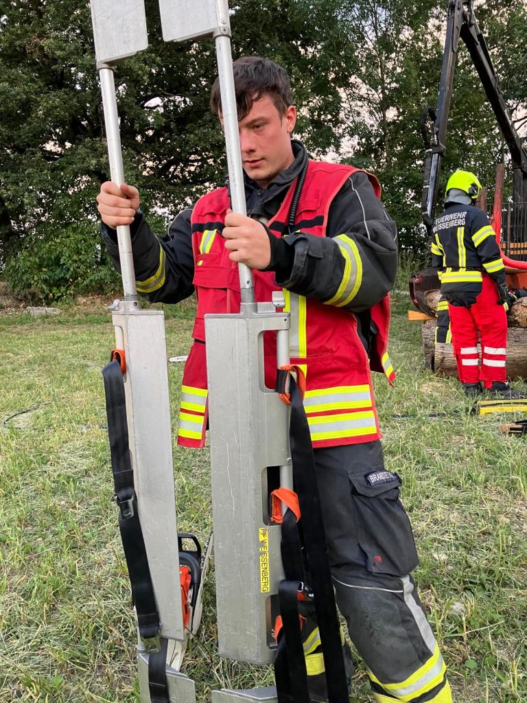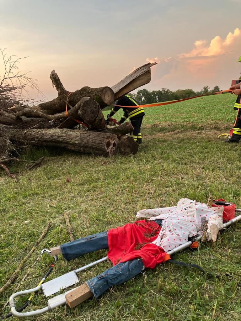 Die Lage war rasch im Überblick unserer Gruppenkommandanten und die Mannschaft konnte schnell und effektiv mittels Motorsäge, Hebekissen und Unterlegkeilen unsere Dummys befreien. Im Ernstfall würde man hier natürlich ein Notarztteam benötigen um eine patientenschonende Befreiung gewähleisten zu können.