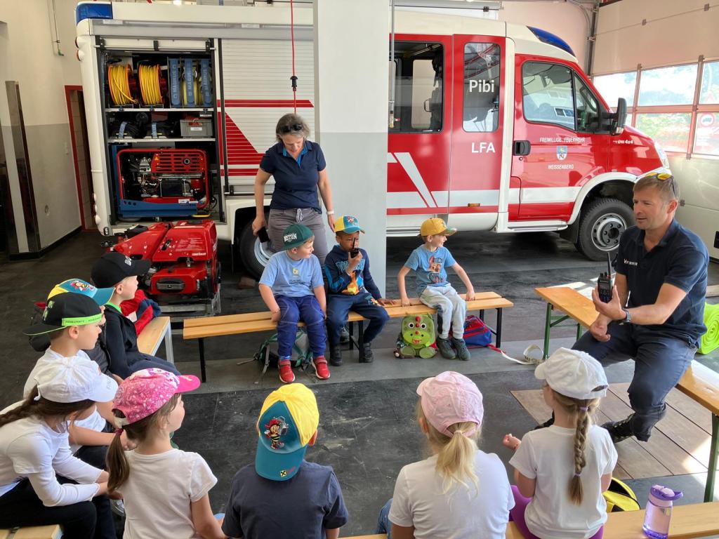 Nach dem steilen Aufstieg über den Weißenberg stärkten sich die Kinder zunächst bei einer Jause. Anschließend durften sie selbst aktiv werden: Es wurden Schläuche gewickelt, mit dem Funkgerät die Notrufsimulation geübt und unser hydraulisches Rettungsgerät ausprobiert – normalerweise im Einsatz bei Verkehrsunfällen, gestern im Einsatz zum Nüsse knacken.